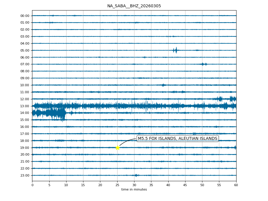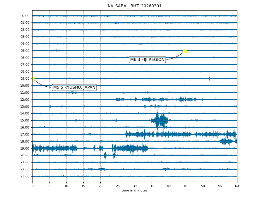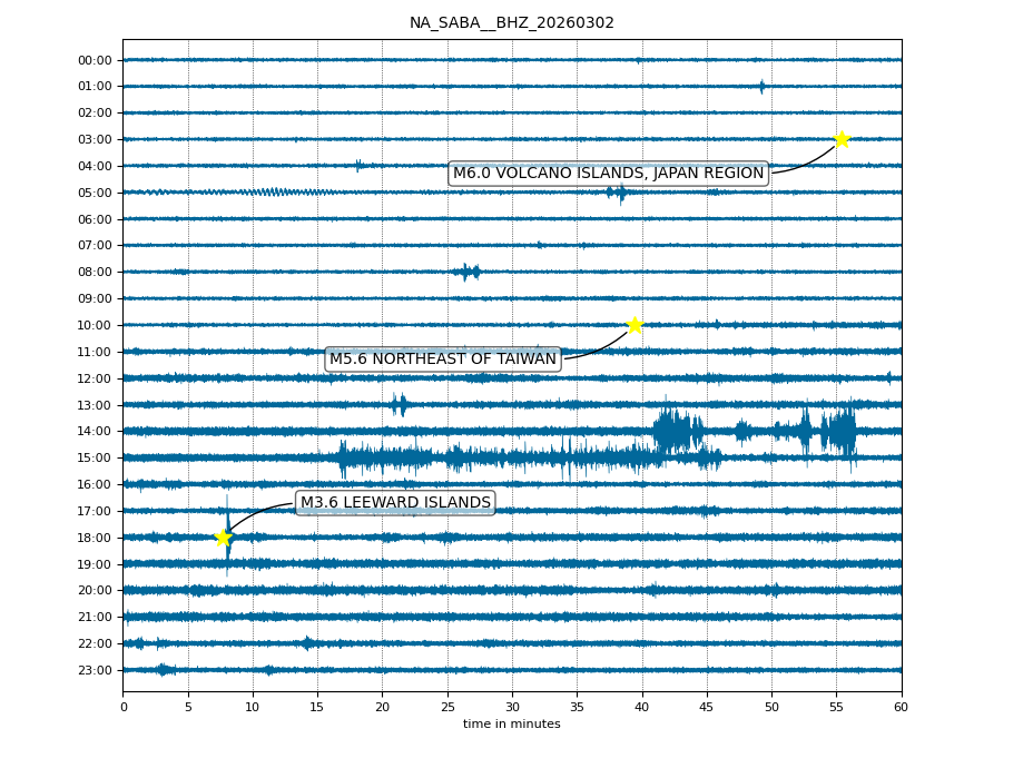 KNMI deploys a number of broad-band seismometers on Saba, St. Eustice and St. Maarten to monitor ground motion due to earthquakes and/or volcanic activity. Recordings of the vertical ground motion at each seismometer are displayed by the links below, with a delay of about 15 minutes behind current time. Data from station SEUB is shown with a delay of one day, data from SABN and SEUH are displayed after two days. Time of the recordings is given in UTC. Local time on Saba, St. Eustatius and St. Maarten is 4 hours behind UTC."Live seismogram per station: - SABA - Saba, St. Johns